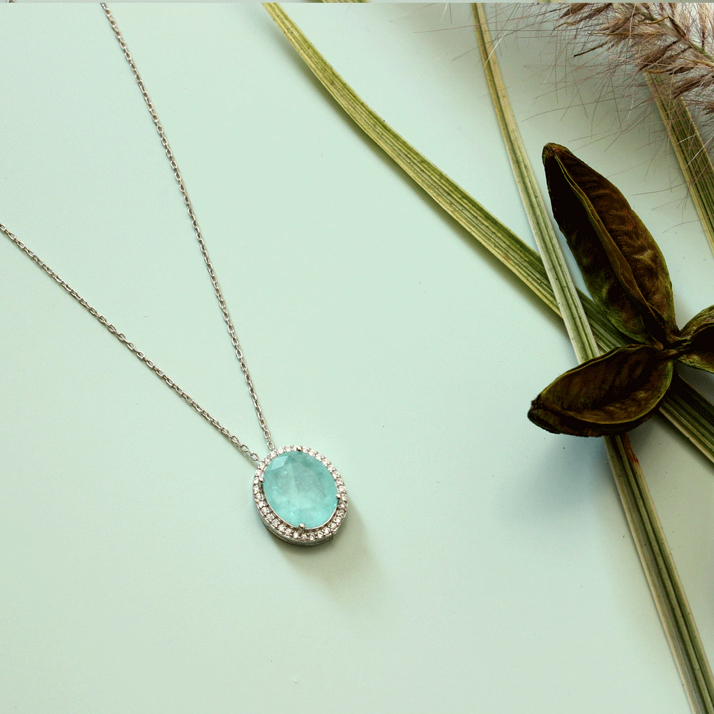 Colar perfeito para destacar a sua personalidade moderna e sofisticada. Essa joia foi elaborada com pedra fusion turmalina , que são composta de pedra natural e cristal que tem este brilho especial e as zircônias envolvendo em torno da peça .Está pedra lembra muito a pedra natural Turmalina Paraíba em harmonia com a prata 925 .